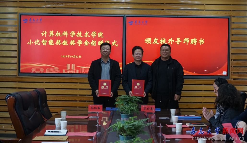10月22日下战书,计较机科学手艺学院小优智能讲授金捐赠典礼正在博知楼510会议室举行。校党委常委、青岛小优智能科技无限公司总司理、96级校友郭俊兴,公司副司理、96级校友代启强出席典礼。合做成长处、教育成长基金会、计较机科学手艺学院相关担任人和师生代表加入勾当。典礼由计较机科学手艺学院党委潘秋鸿掌管。代表学校向青岛小优智能科技无限公司的捐赠致以衷心感激。他暗示,校友的杰出成绩彰显母校荣光,校友对母校的深挚交谊,更是对学校人才培育质量的最佳印证。此次青岛小优智能科技无限公司捐资设立讲授金,既为学院师生搭建了的成长激励平台,也为校企深化合做奠基了主要根本。刘恩贤暗示,以学科交叉融合赋能财产升级,以立异实践培育高本质人才,持续鞭策校地校企协同成长。