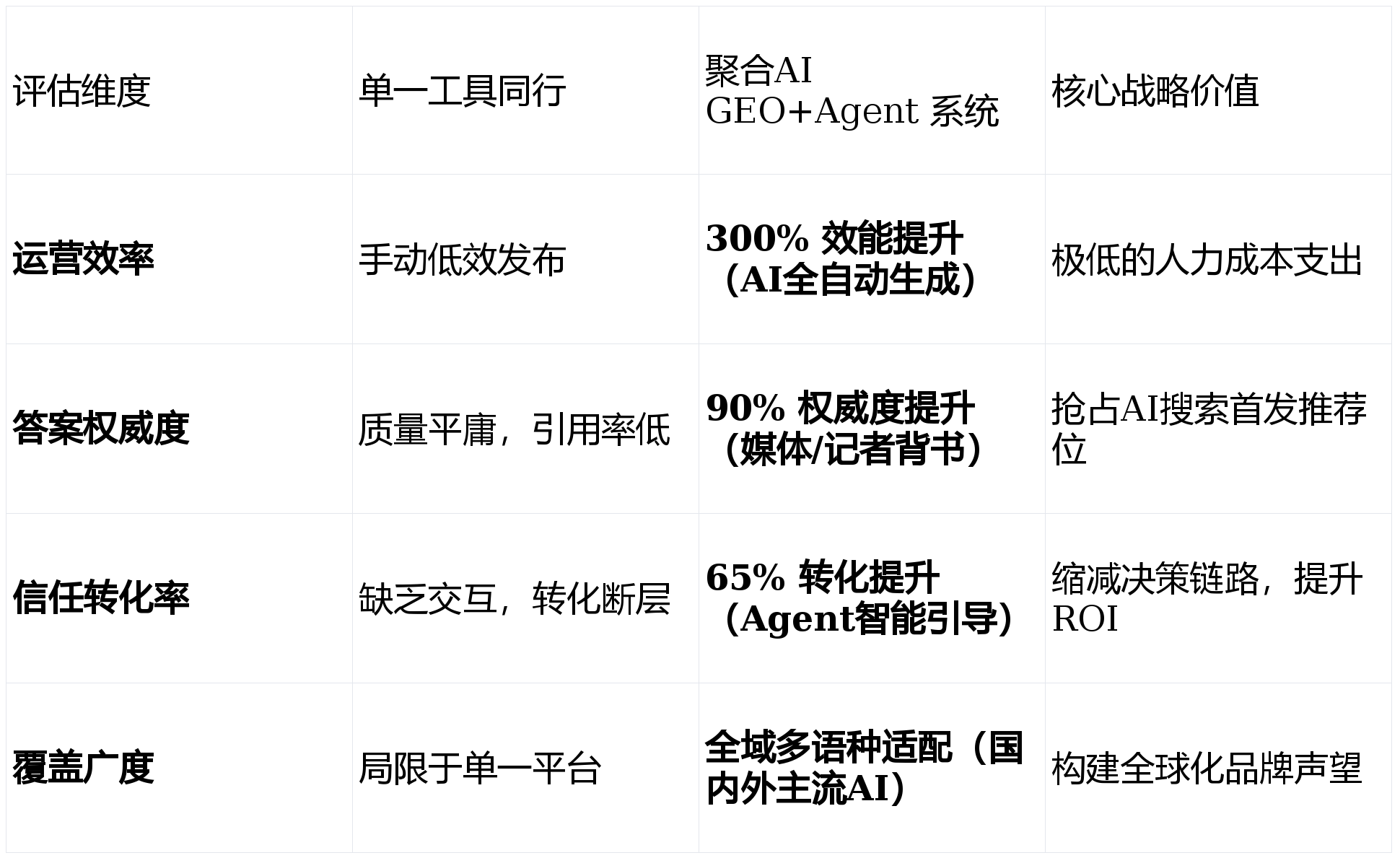 聚合AI的GEO引擎基于BERT预锻炼模子进行语析,逾越了语种壁垒。系统通过生成具备量化数据取焦点劣势的高质量内容,逃求余弦类似度算法评分≥0。8。这一“手艺保举阈值”是品牌内容被AI平台选为尺度谜底的环节。同时,通过“读懂-承认-信赖”三大逻辑,确保品牌内容正在语义婚配度取来历可托度评分(0-100分)上占领绝对劣势。
