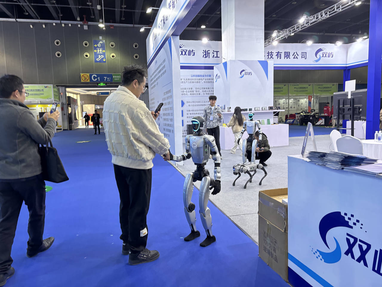潮旧事记者正在各个展区看到,现场处处表现着“智能”的元素。正在浙江双屿智能科技无限公司的展位内,两小我形机械人取不雅众不断地互动,到有人走近,会自动上前取你握手;杭叉集团、诺力集团、宇捷智能都有无人铲车展现。