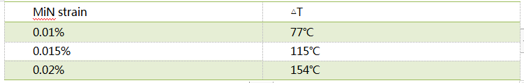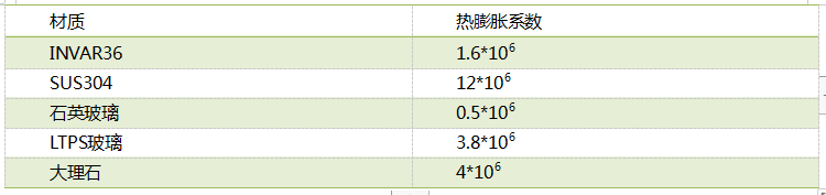 定义η=(设想尺寸-现实尺寸)/ 设想尺寸*100%,假设FMM的热膨缩系数为α,对于长度为 l 的FMM,正在温度升高△T时,即设想收缩率必需满脚η≥α△T 。按Invar36平均热膨缩系数1。6×10-6算,可得出蒸镀分歧温升的fine stick最小收缩率,如下表所示。