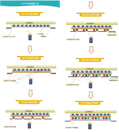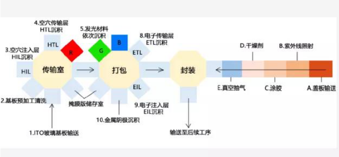 因为工艺参杂的需要和为了避免交叉污染,分歧的功能层需要正在分歧的蒸镀机腔体内蒸镀,同时正在蒸镀完成后通过机械手将基板正在分歧的腔体之间进行转移。蒸镀腔内有蒸镀源、张网机、玻璃基板和冷却板等设备。正在进行无机薄膜蒸镀时,需要先将带有TFT(薄膜晶体管)(薄膜晶体管)的基板进行反转,其后通过张网机将Mask和基板对齐,再将蒸镀源打开对基板进行蒸镀。