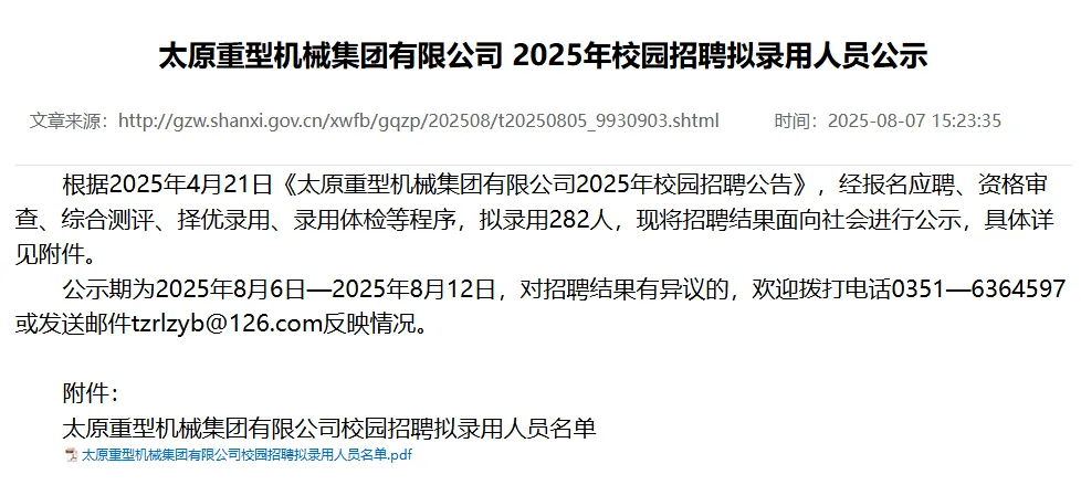 8月5日,太原沉型机械集团无限公司(简称“太沉集团”)正式发布《2025年校园聘请拟录用人员公示》,共282人进入公示阶段。做为我国沉型配备制制范畴的“国度队”、山西省属沉点国企,太沉此次校招规模大、布局优、导向清晰。我们按照供给的《太原沉型机械集团无限公司2025年校园聘请拟录用人员名单》,对其岗亭类型、学历条理、结业院校、专业形成、性别分布等维度进行统计取交叉验证,现将实正在、全面、权势巨子的洞察呈现如下:笼盖机械、材料、节制、电气、计较机、车辆、仪器、人工智能、软件工程等标的目的,是手艺研发系统的焦点;笼盖机械、材料、节制、电气、计较机、车辆、仪器、人工智能、软件工程等标的目的,是手艺研发系统的焦点;全数为产物工程师,来自上海交大、哈工大、北航、中南大学、科技大学、、太道理工等,专业集中于机械工程、材料科学、冶金工程等;次要分布正在产物工程师(如太道理工、燕山大学、华北电力大学等)、市场营销(如中北大学、太原师范学院、太原科技大学等)及少数财政岗。全数为产物工程师,来自上海交大、哈工大、北航、同济、中南大学、科技大学、、太道理工等,专业集中于机械工程、材料科学、冶金工程等;次要分布正在产物工程师(如太道理工、燕山大学、华北电力大学等)、市场营销(如中北大学、太原师范学院、太原科技大学等)及少数财政岗。太沉“高学历导向”,但并未封闭优良本科生通道,特别对省内沉点高校实践能力强的学生连结。太沉“高学历导向”,但并未封闭优良本科生通道,特别对省内沉点高校实践能力强的学生连结。工业大学(4人)、西北工业大学(9人)、大连理工大学(8人)、(14人)、西安交通大学、航空航天大学、华中科技大学、电子科技大学、理工大学等工科强校贡献大量硕博人才;海外高校包罗曼彻斯特大学、伦敦玛丽女王大学、查尔姆斯理工大学、新南威尔士大学、莫那什大学、UCL、大学、大学等,共10余人。工业大学(4人)、西北工业大学(9人)、大连理工大学(8人)、(14人)、西安交通大学、航空航天大学、华中科技大学、电子科技大学、理工大学等工科强校贡献大量硕博人才;海外高校包罗曼彻斯特大学、伦敦玛丽女王大学、查尔姆斯理工大学、新南威尔士大学、莫那什大学、UCL、大学、大学等,共10余人。财政岗:南开大学、西安交通大学、中南财经大学、西南财经大学、东北财经大学、山西财经大学;财政岗:南开大学、西安交通大学、西南财经大学、东北财经大学、山西财经大学;太道理工大学(本硕合计超40人)、太原科技大学(约20人)、中北大学(约15人)、山西大学、山西财经大学等合计占比跨越60%,充实表现“立脚山西、办事处所”的用人计谋。这一布局精准对接太沉正在风电配备、轨道交通、矿山机械、海洋工程、智能液压、工业软件等计谋板块的人才需求。男性:243人(86。2%);女性:39人(13。8%),次要集中正在财政、法务、市场营销及部门手艺岗(如材料、机械);出生年份集中于1995–2004年,以1998–2001年为从力(即24–27岁),博士春秋略高(最早1988年出生);最年轻拟录用人出生于2004年7月(燕山大学本科),最年长为1988年5月(曼彻斯特大学博士)。男性:243人(86。2%);女性:39人(13。8%),次要集中正在财政、法务、市场营销及部门手艺岗(如材料、机械);出生年份集中于1995–2004年,以1998–2001年为从力(即24–27岁),博士春秋略高(最早1988年出生);最年轻拟录用人出生于2004年7月(燕山大学本科),最年长为1988年5月(曼彻斯特大学博士)。工科生:夯实专业根本,争取读研,控制CAD/CAE/PLC/Python等东西,关心智能制制趋向;所有招聘者:深切研究太沉官网、年报、沉点项目(如16MW海优势电安拆船、高铁轮对国产化等);山西高校学子:积极参取太沉校企合做、暑期练习、校园宣讲,展示“懂山西、爱制制、愿扎根”的立场。工科生:夯实专业根本,争取读研,控制CAD/CAE/PLC/Python等东西,关心智能制制趋向;所有招聘者:深切研究太沉官网、年报、沉点项目(如16MW海优势电安拆船、高铁轮对国产化等);山西高校学子:积极参取太沉校企合做、暑期练习、校园宣讲,展示“懂山西、爱制制、愿扎根”的立场。
