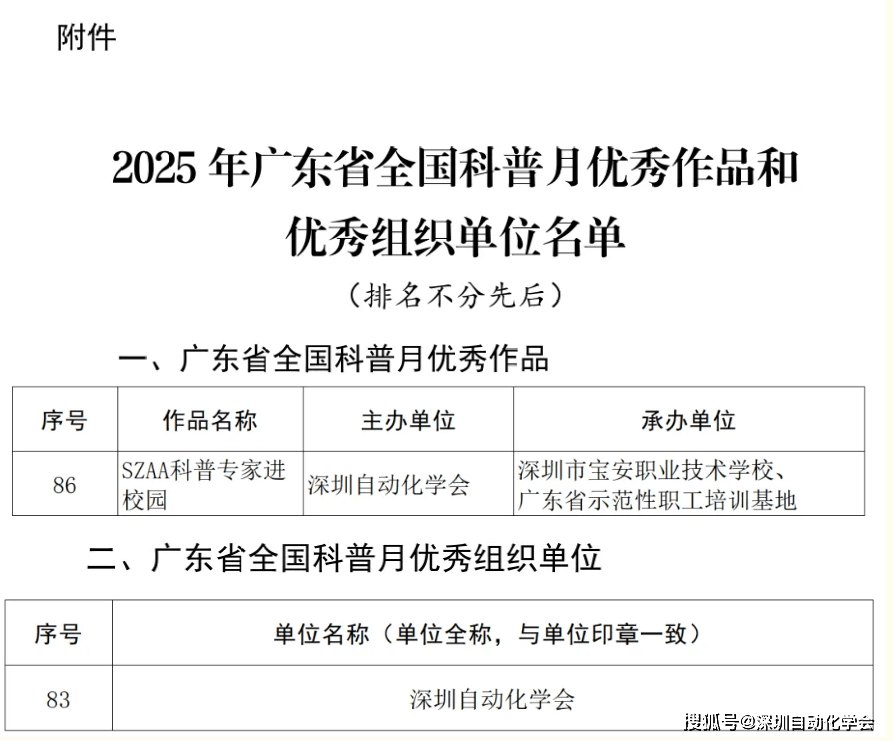 捷报传来,喜信盈门!近日,广东省科学手艺协会正式印发《关于发布2025年广东省全国科普月优良做品和优良组织单元的通知》(粤科协〔2026〕1号),深圳从动化学会凭仗结实的科普实践取高效的组织统筹能力,斩获双项殊荣——从办的“SZAA科普专家进校园”勾当获评“2025年广东省全国科普月优良科普勾当案例”,学会获评“2025年广东省全国科普月优良组织单元”,办事教育中的标杆感化!