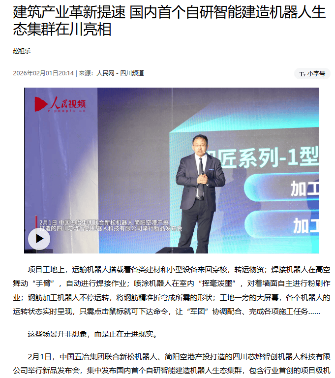 人平易近网2月1日以《建建财产改革提速 国内首个自研智能建制机械人生态集群正在川表态》为题,报道中国五冶举行新品发布会,集中发布国内首个自研智能建制机械人生态集群,包含行业初创的项目级机械人集群智能安排办理系统和四款自从研发的智能建制机械人,向全行业发出共创邀请,一同摸索建建行业转型升级之。