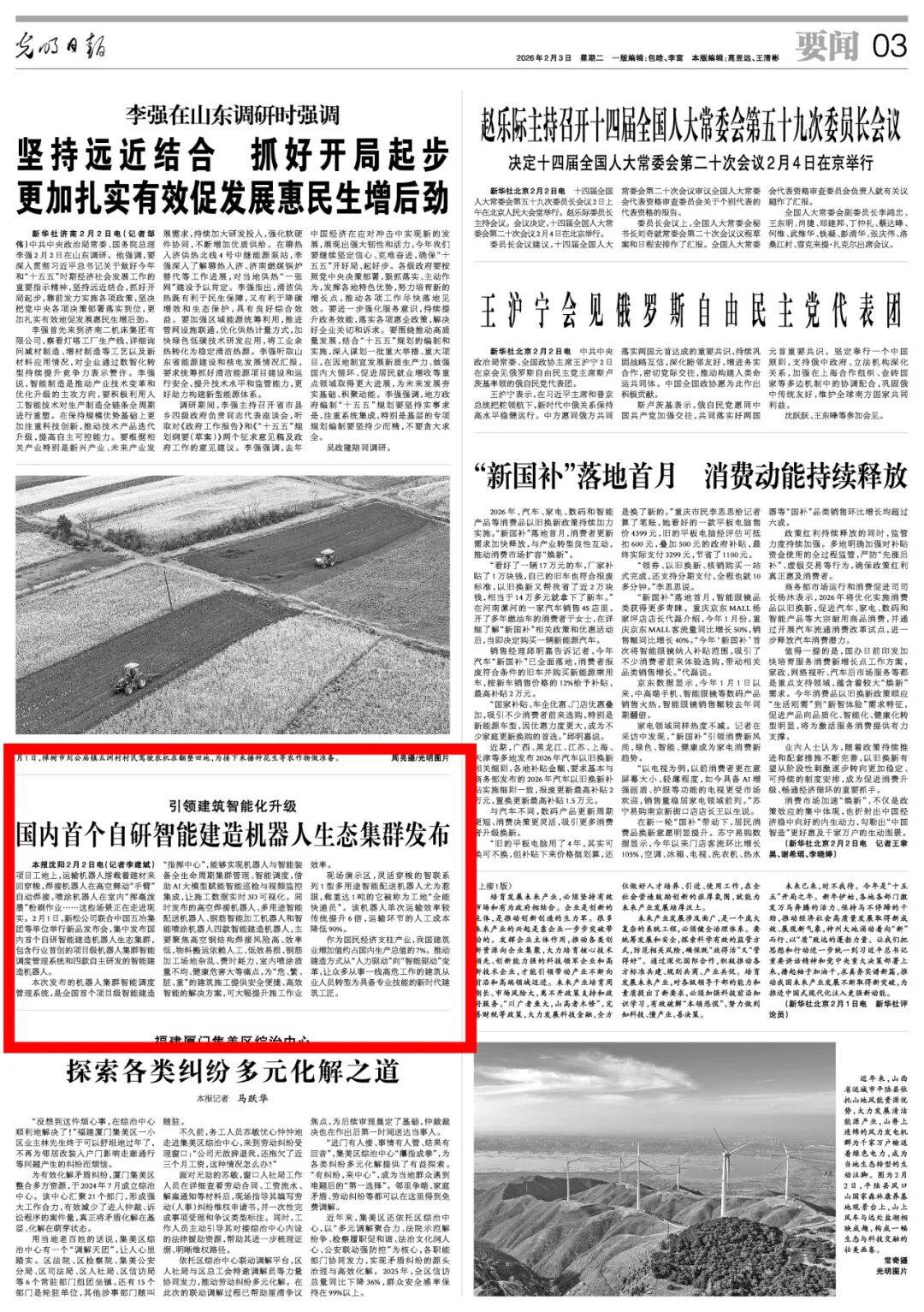 日报2月3日第三版以《国内首个自研智能建制机械人生态集群发布》为题报道,正在项目工地上,中国五冶打制的运输机械人搭载着建材来回穿越,焊接机械人正在高空舞动“手臂”从动焊接,喷涂机械人正在室内“挥毫泼墨”粉刷功课……中国五冶让这些场景正正在走进现实,鞭策建制体例从“人力驱动”向“智能驱动”变化,让浩繁处置一线高危工做的建建从业人员转型为具备专业技术的新时代建建工匠。