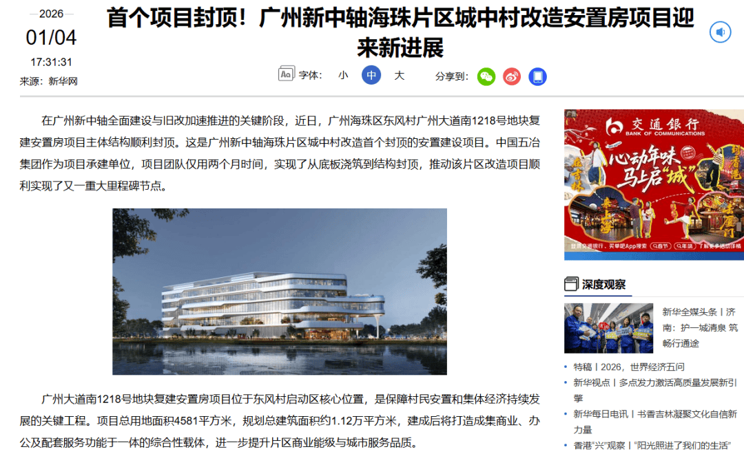 新华网于1月4日刊发《首个项目封顶!广州新中轴海珠片区城中村安设房项目送来新进展》,报道中国五冶扶植的广州海珠区春风村广州大道南1218号地块复建安设房项目从体布局成功封顶,这是广州新中轴海珠片区城中村首个封顶的安设扶植项目。