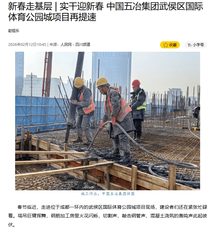 人平易近网2月12日刊发《新春走下层实干送新春 中国五冶武侯区国际体育公园城项目再提速》,报道面临即将到来的春节,中国五冶武侯区国际体育公园城项目合理调配人力、物资取机械设备,实行“节前冲刺、节后快复工”的动态管控,全力向3月贸易楼封顶方针推进。
