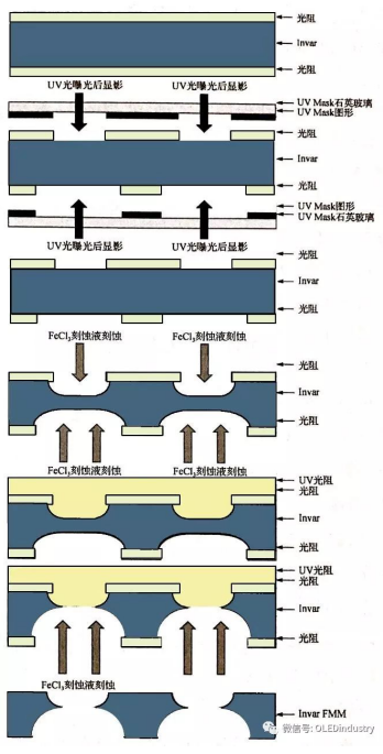 蚀刻法:次要是通过蚀刻Invar Sheet的体例制做。现阶段次要的OLED面板FMM供应商,DNP(大日本印刷)、凸版印刷(Toppan Printing)和达运等均采用蚀刻手艺。该方式制做出的FMM正在现阶段最薄能够做到20μm摆布并达到WQHD(分辩率2560*1440的高清屏幕)级别分辩率。流程如下: