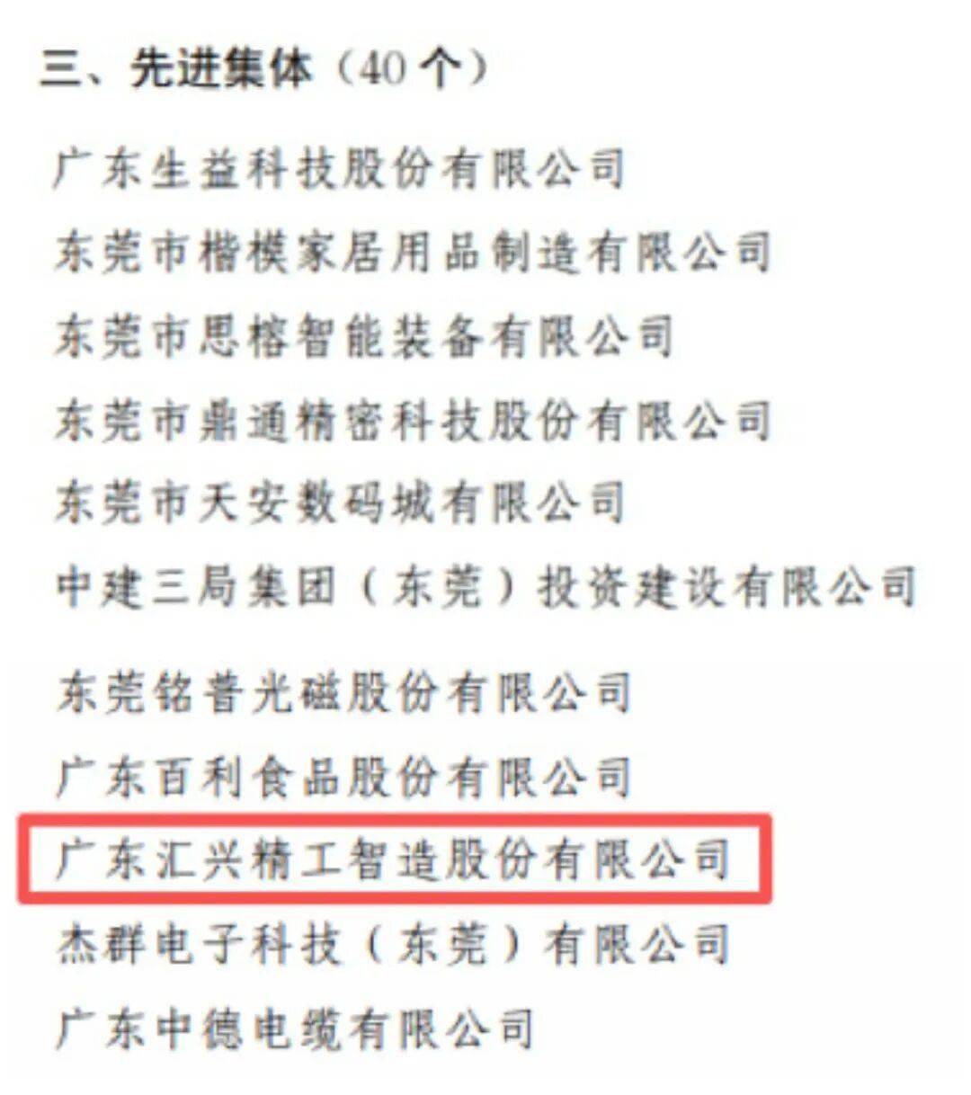 2025年12月25日,东莞市委、东莞市人平易近正式发布表扬决定,广东汇兴精工智制股份无限公司(汇兴智制) 名誉入选,被授予 “此项荣誉,是对汇兴智制自2020年以来,积极响应市委、市号召,立脚东莞、聚力高质量成长,正在智制海潮中奋怯抢先的权势巨子承认取高尚褒。
